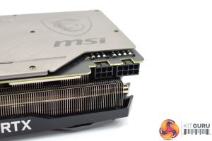 The two fans are – as we saw from the back of the box – MSI's Torx 3.0 design. They measure 100mm in diameter and use what MSI calls ‘dispersion fan blades' – meaning the blade design is curved to improve airflow. Somewhat laughably, MSI also says these fans are for ‘gaming with balls of steel'… thanks to the double ball bearings used, of course.