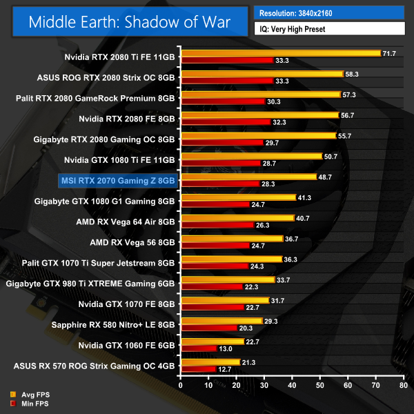 Middle Earth: Shadow of War has the RTX 2070 a lot closer to the performance of the GTX 1080 Ti than the other titles we've tested so far. For instance, it's only 6.7FPS slower at 1080p, but that makes it almost 17FPS faster than a GTX 1080.