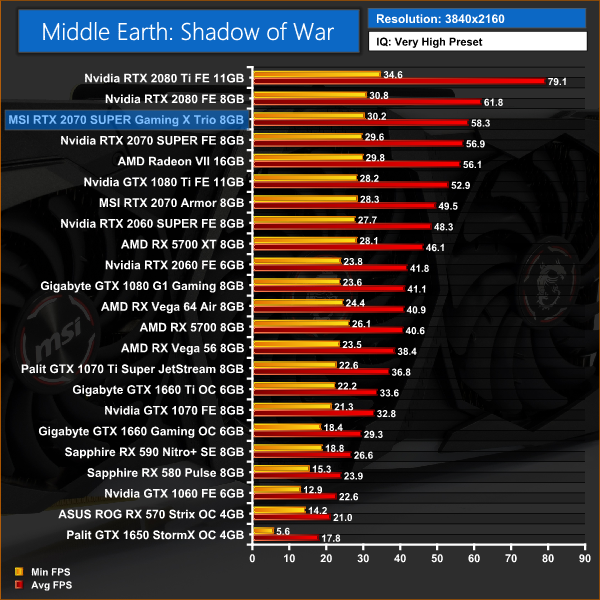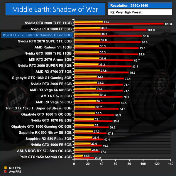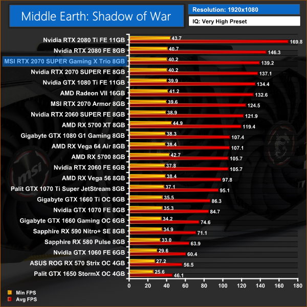 It's the same thing in Shadow of War, too – the MSI is not much faster than the Founders Edition at all, though the RX 5700 XT is significantly slower in this title.