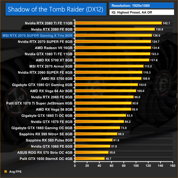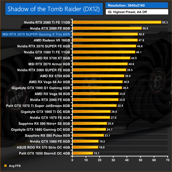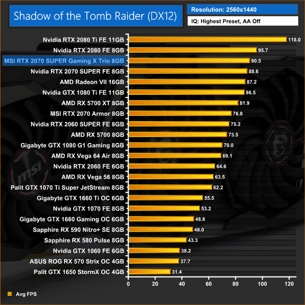 Shadow of the Tomb Raider serves as another example of how close the two 2070 SUPER cards are in terms of performance. The Gaming X Trio is also 8FPS faster than the 5700 XT at 1440p.