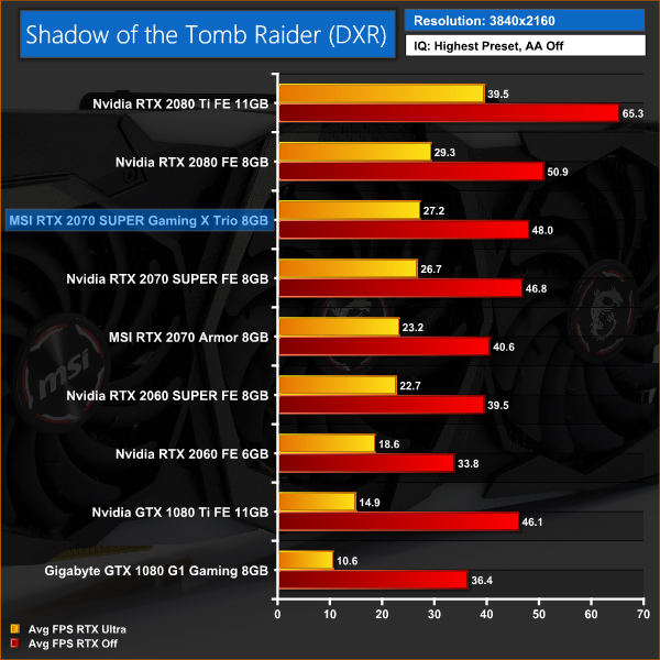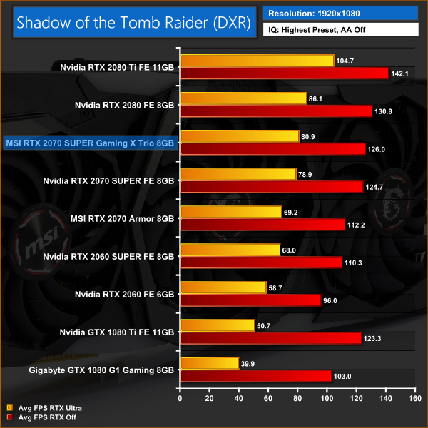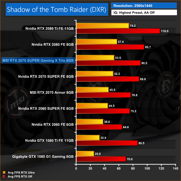 Things are as expected when enabling ray traced shadows in this title. Performance with RTX on is decent here, with the Gaming X Trio averaging over 50FPS, even at 1440p. That's still a 40FPS hit compared to RTX off, mind you.