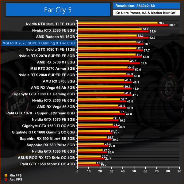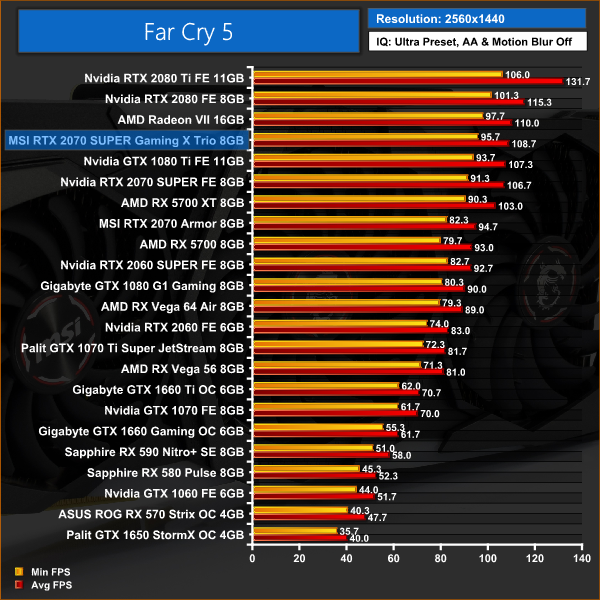 Far Cry 5 sees the MSI 2070 SUPER easily outpacing the 5700 XT, coming in a couple of frames faster than the reference-clocked Founders card.