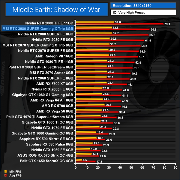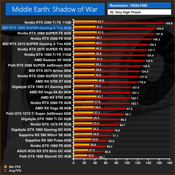 Middle Earth: Shadow of War has a 2% performance advantage for the MSI 2080 SUPER versus the Founders Edition, but that works out at just a couple of frames when gaming at 1440p.