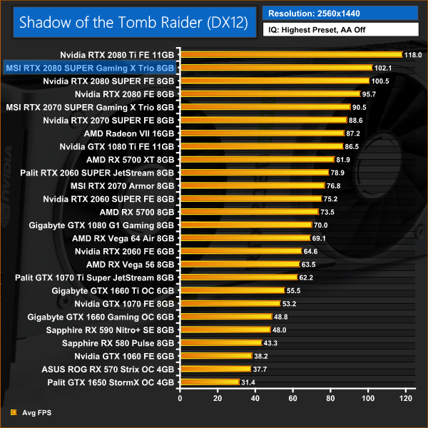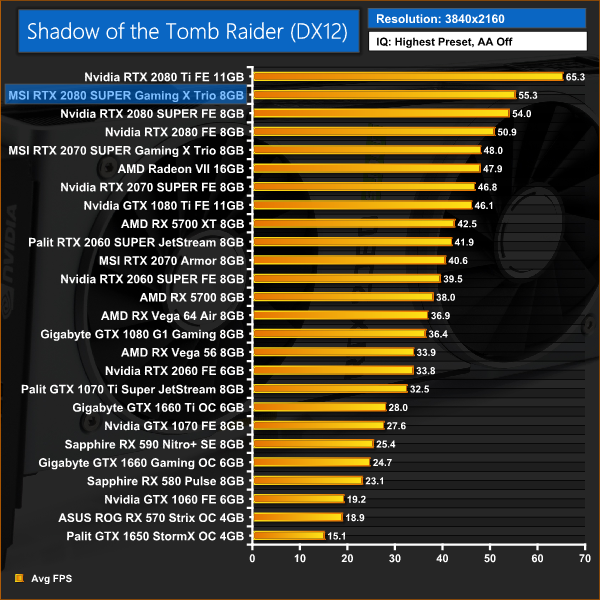 MSI's 2080 SUPER is just 1.3FPS faster than the Nvidia Founders Edition when playing Shadow of the Tomb Raider at 4K. At the same resolution, it manages an extra 4.4FPS over the original 2080.