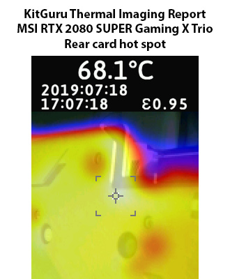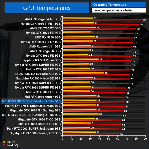 We already know from our 2070 SUPER Gaming X Trio review that this cooler is very effective, and we again see impressive results here, with the 2080 SUPER peaking at 68C under load. This is a 7C reduction in temperatures versus the Founders Edition, and while it is 3C hotter than the 2070 SUPER from MSI, the 2080 SUPER has 512 more CUDA cores so we would expect slightly higher temperatures.