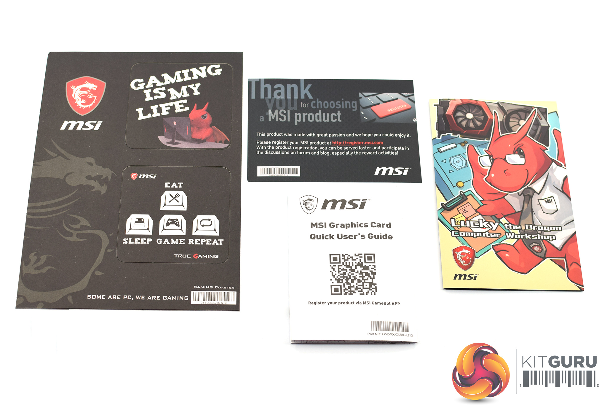 Inside, the accessory bundle is plentiful. We find 2x disposable coasters, 1x quick start guide, 1x Lucky the Dragon cartoon, and 1x ‘thank you' note from MSI.