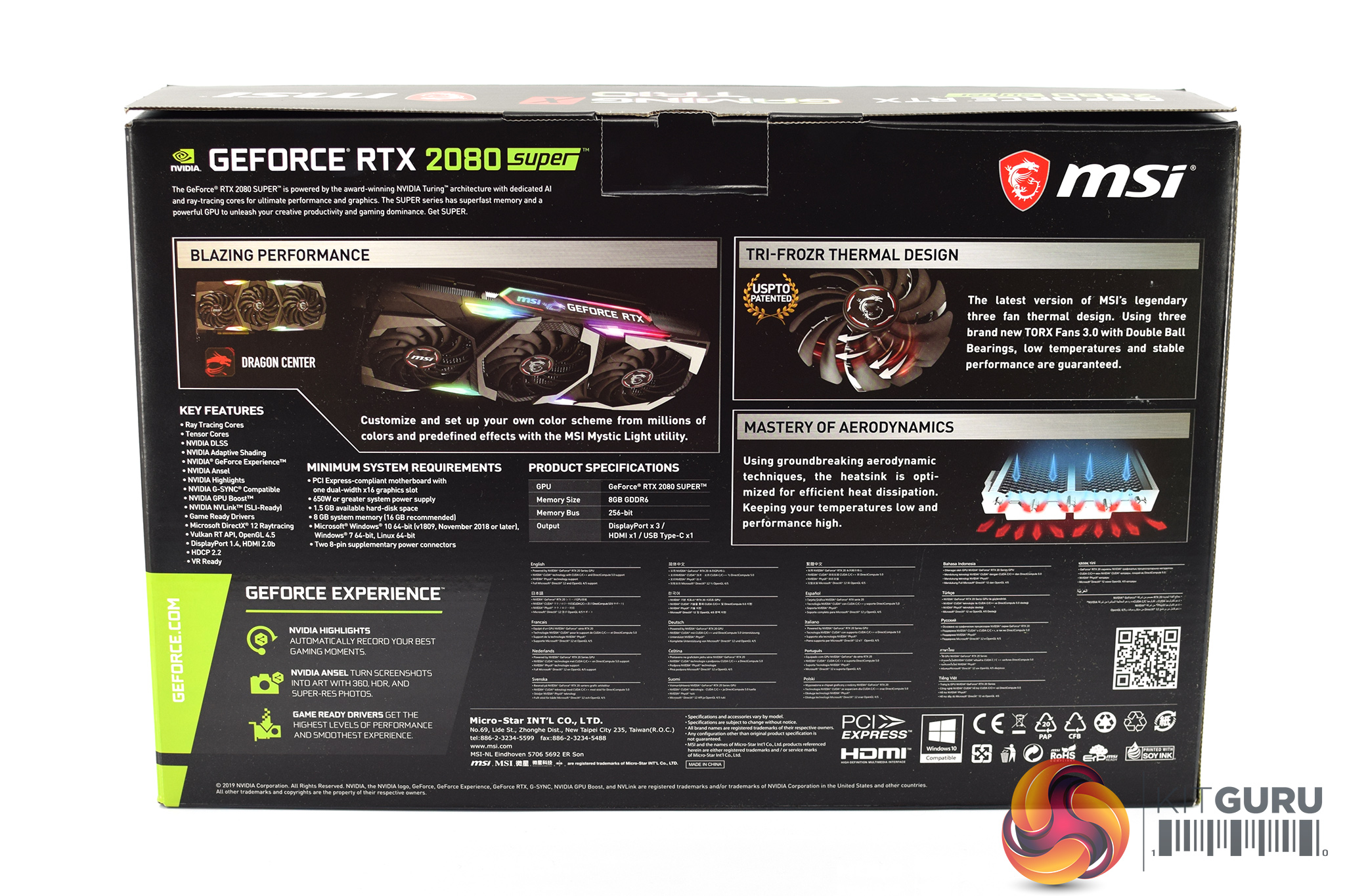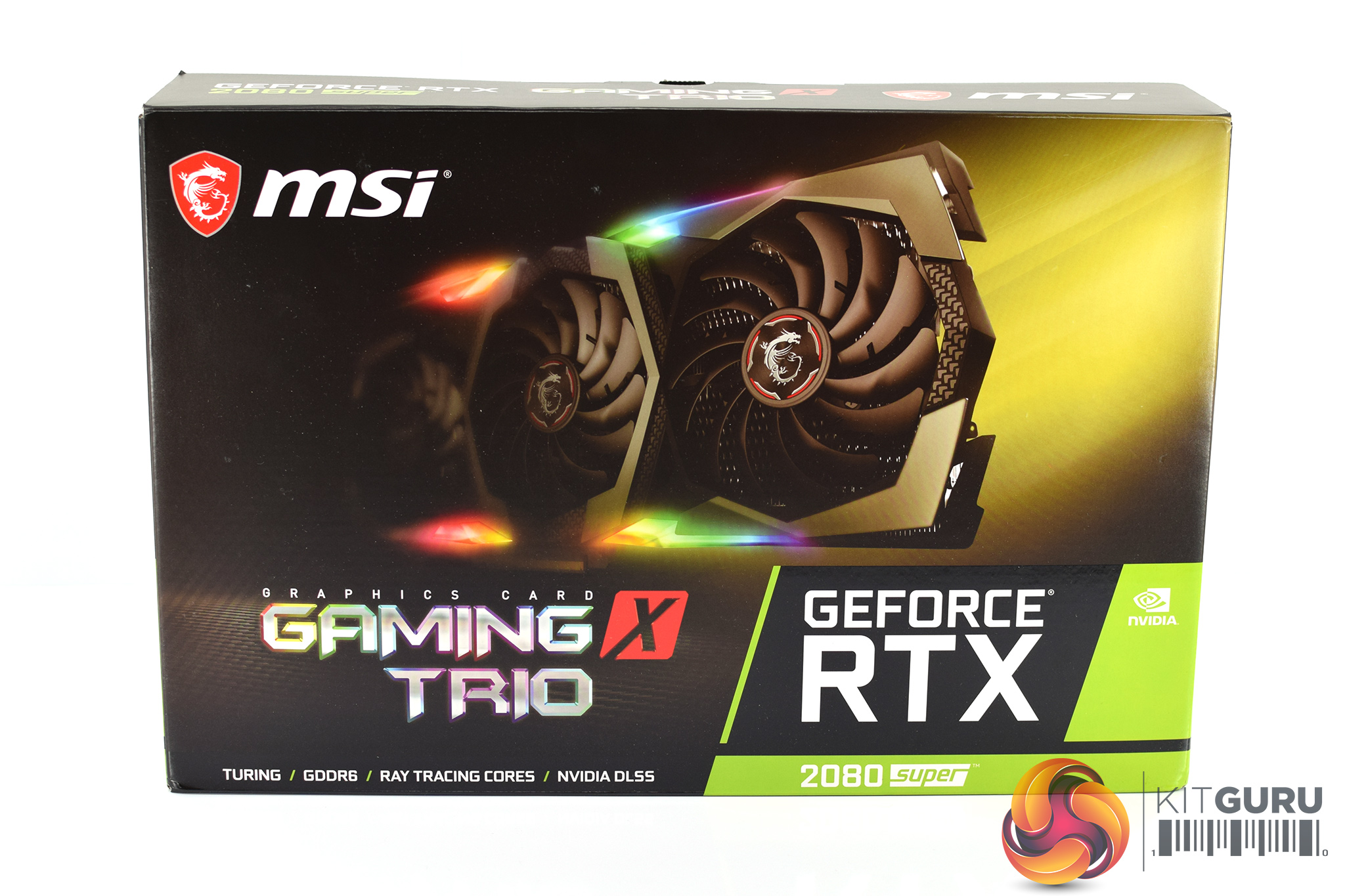 The MSI RTX 2080 SUPER Gaming X Trio ships in an identical box to the 2070 SUPER Gaming X Trio we reviewed a couple of weeks ago, with the only difference being the ‘2080 SUPER' logo instead of ‘2070 SUPER'.
