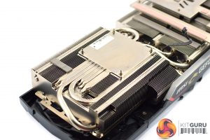 The heatsink is also the same as the 2070 SUPER, meaning it uses two separate aluminium fin stacks that are connected by 7 nickel-plated heatpipes. Of these, 6 measure 6mm in diameter and the last one measures 8mm in diameter. There's a separate coldplate for the GPU die, and another for the VRM as well with all the necessary thermal pads.