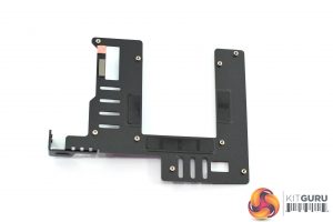 Taking the card apart, the first thing to note about the PCB is the metal frame which is screwed onto the left-hand portion of the board. This acts as a mini heatsink for the VRAM chips (it has thermal pads to contact with them) while it also provides some extra rigidity for the card. It screws into both the backplate and the I/O bracket.