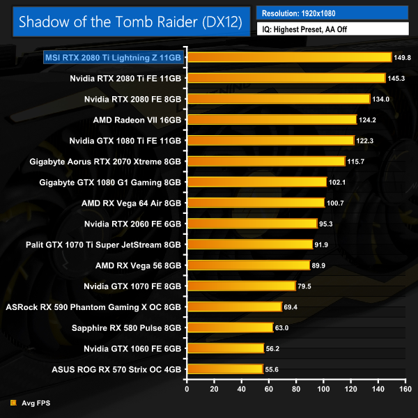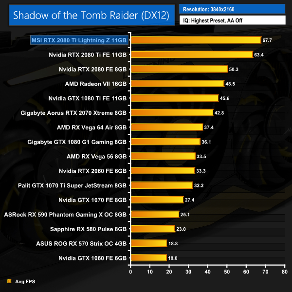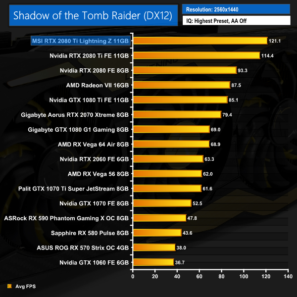 Shadow of the Tomb Raider confirms what we already know – the Lightning Z is seriously fast. It averages over 120FPS at 1440p, and manages almost 70FPS with the resolution bumped up to 4K.