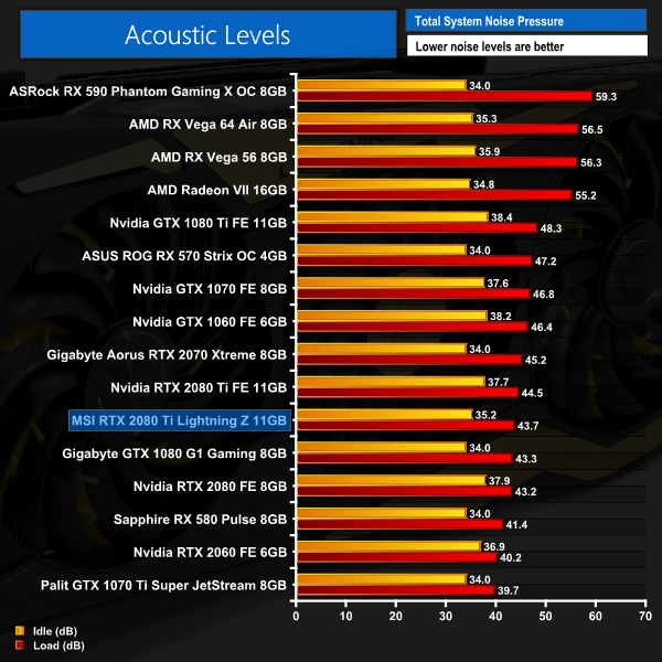 As for noise levels, the Lightning Z is generally pretty inoffensive. It's not the absolute quietest card I've ever tested, but it is still far from loud. In any case, I think it is safe to say this card is targeting the user looking for all-out performance, instead of ultra low noise levels, and even then – like I said – the Lightning Z is still not loud.
