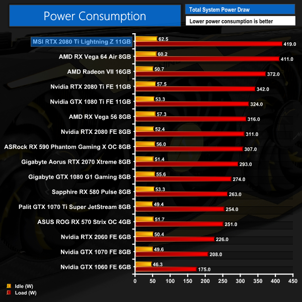 Considering it has a total of 3x 8-pin PCIe power connectors, a huge 16+3 power delivery implementation, and runs at over 1920MHz – it is perhaps not a surprise to see this Lightning Z draw a lot of power. In fact, it even draws more than Vega 64, while Nvidia's Founders Edition RTX 2080 Ti pulls about 80W less.