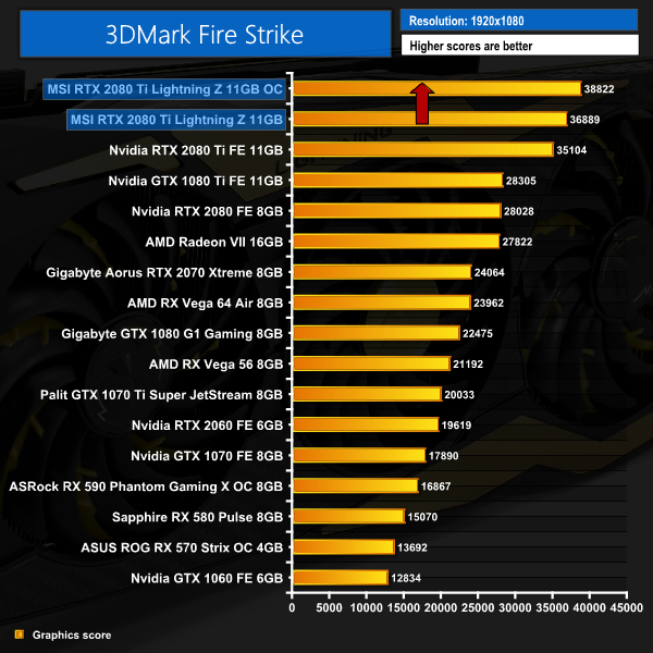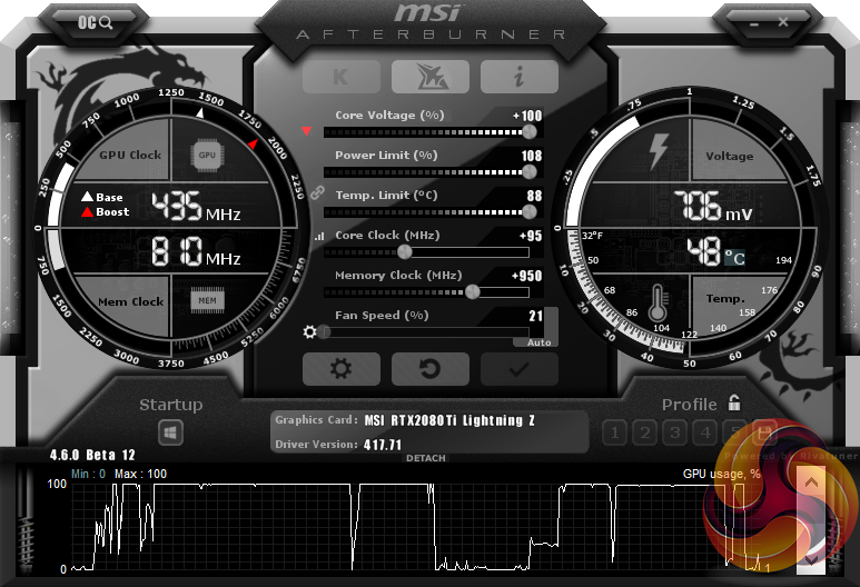 We used MSI Afterburner to overclock the Lightning Z. Our best result came with an extra 95MHz on the GPU core, while we were able to add 950MHz to the GDDR6 memory.