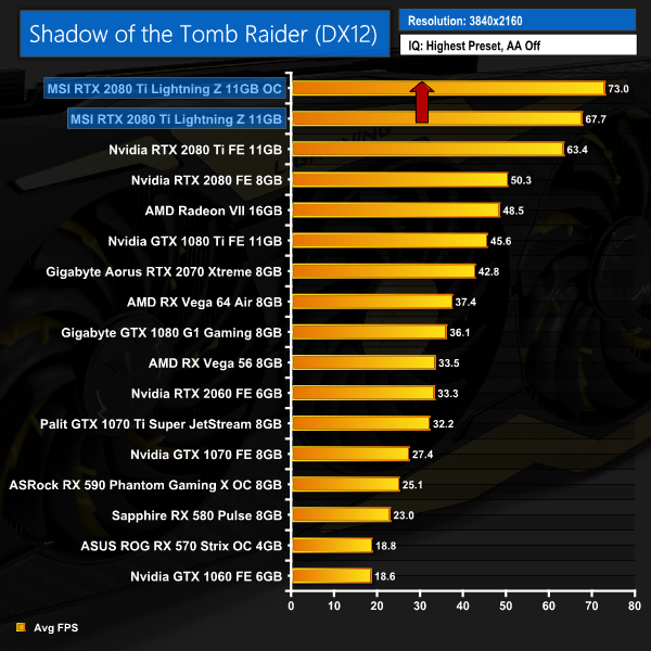 This brought us some decent gains – an extra 5% in Fire Strike, for instance, and then another 5.3FPS when playing Shadow of the Tomb Raider at 4K.