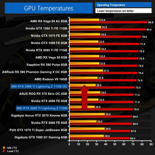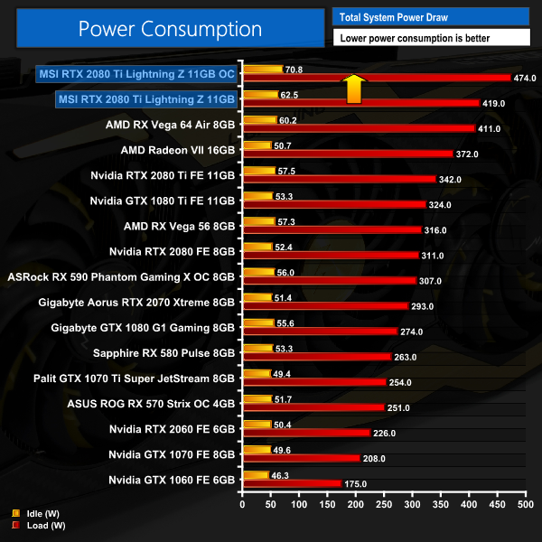 Lastly, it is again not surprising to see power consumption increase even further, with the whole system drawing almost 500W from the wall. The overclocked Lightning Z draws 130W more than a stock Founders Edition RTX 2080 Ti.
