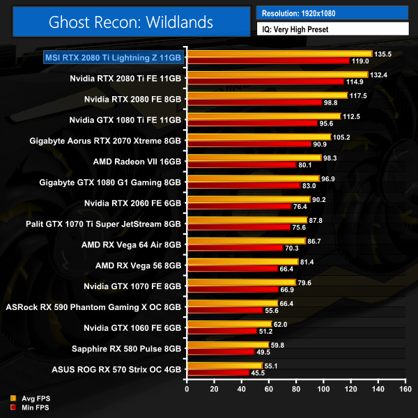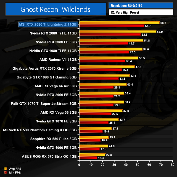 Ghost Recon: Wildlands continues the same trend we have seen from every benchmark so far – the Lightning 2080 Ti comes out on top across all three resolutions tested. It produces almost 70FPS at 4K, with a 2.9FPS lead over Nvidia's Founders 2080 Ti.