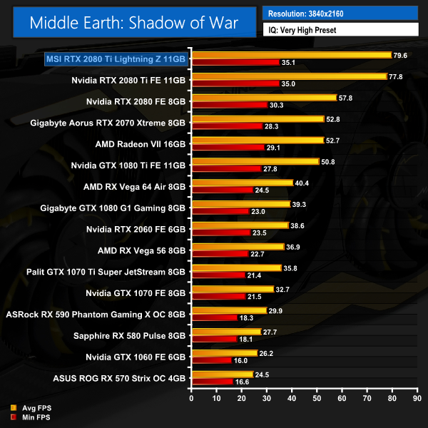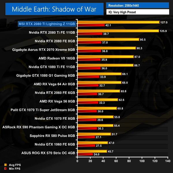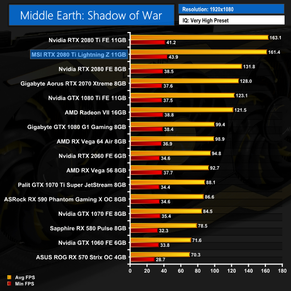 Apart from a slight blip at 1080p where the Lightning Z falls just behind the Founders RTX 2080 Ti, Middle Earth: Shadow of War shows the MSI card to be the faster card at 1440p and 4K. The margins are smaller here, though.