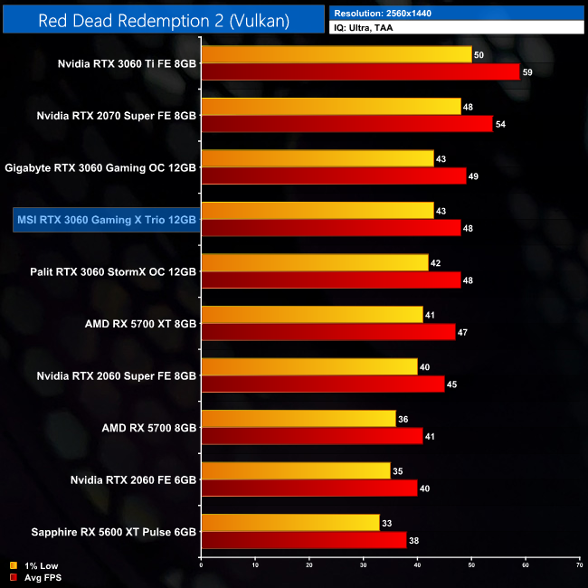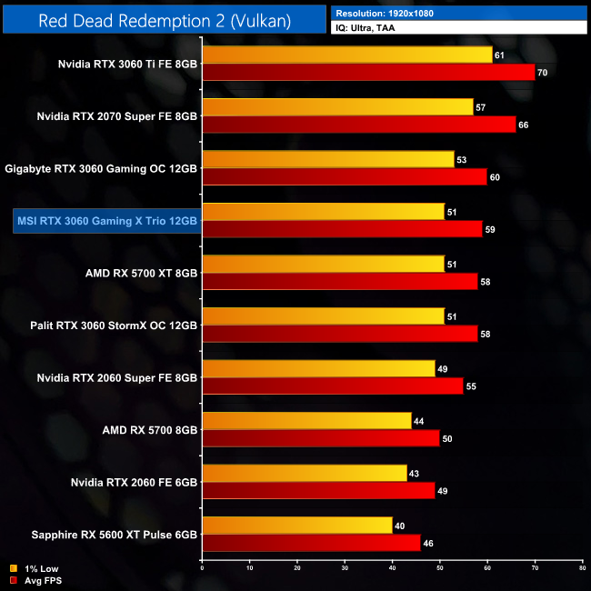 Red Dead Redemption 2 sees the Gaming X Trio come in just shy of the all-important 60FPS mark, as it's 2% slower the Gaming X Trio here, but 2% faster than the StormX OC.