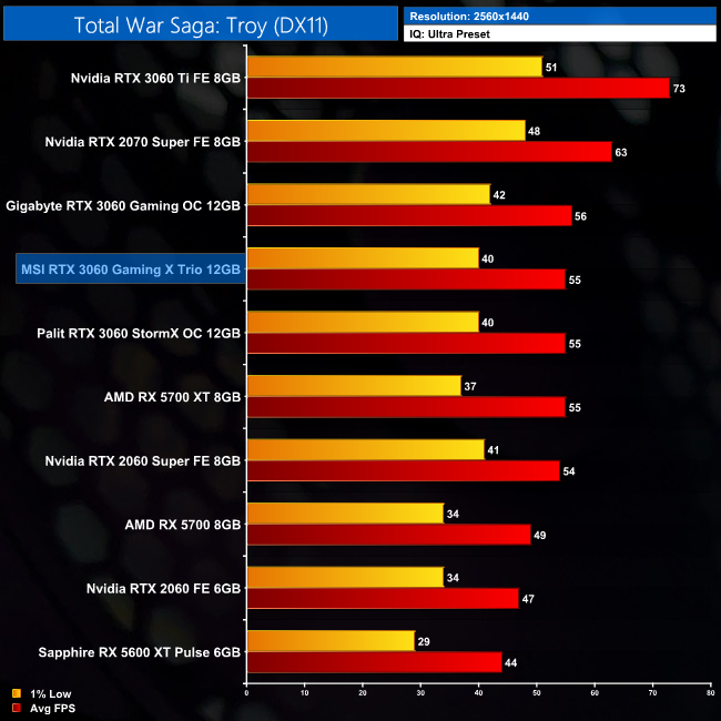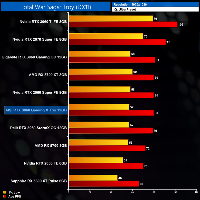 Our penultimate game of the day is Total War Saga: Troy, and here the Gaming X Trio is an exact match for the RX 5700 XT. It is, however, just 14% faster than the RTX 2060 Founders Edition.