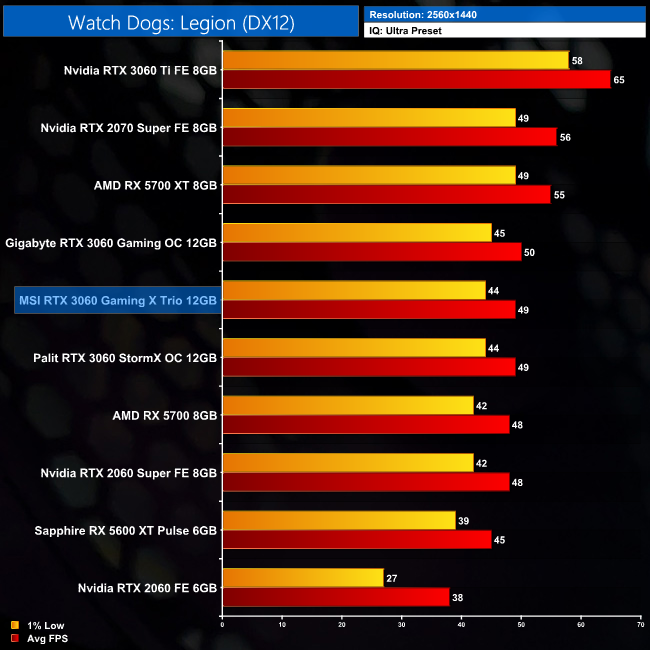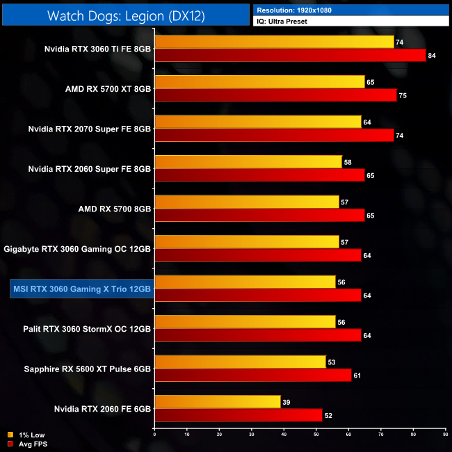 Finally we have Watch Dogs: Legion, where there's absolutely no difference between all three RTX 3060s on test when looking at 1080p. All three average 64FPS, which is 23% higher than the RTX 2060.