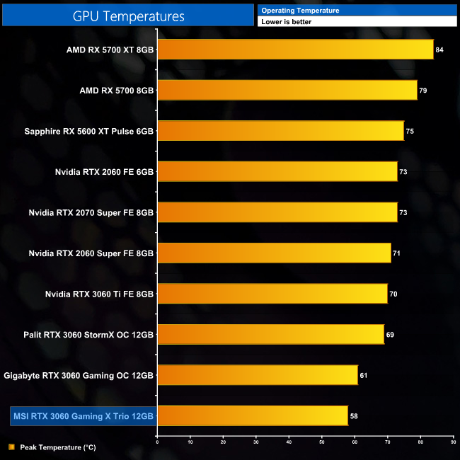 In terms of out of the box thermals now, the Gaming X Trio is nothing short of fantastic. The GPU temperature peaked at just 58C, while we can also see the hot spot hit just 70C. That means it ran 3C cooler than the Gigabyte Gaming OC, but 10-11C cooler than the Palit StormX OC. No matter how you slice it, a sub-60C temperature is hugely impressive.