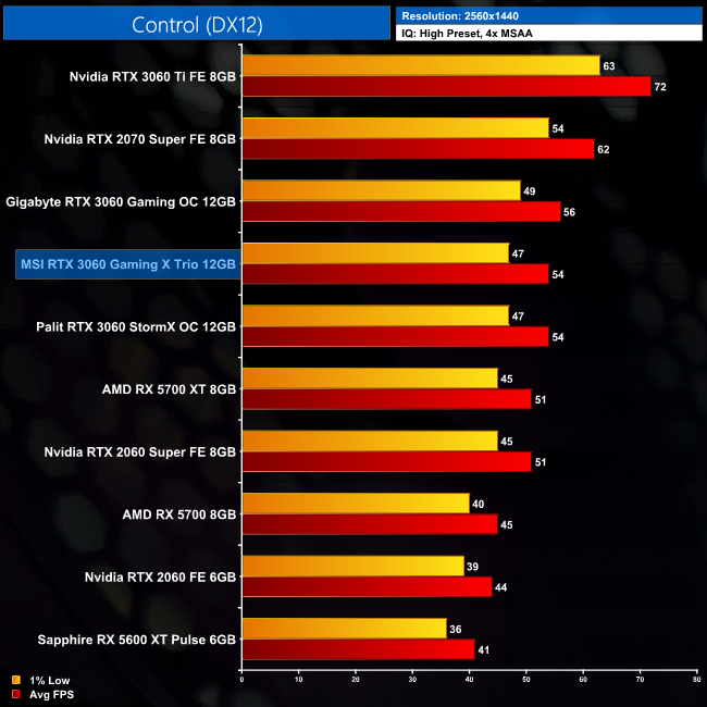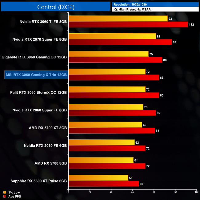 As for Remedy's Control, here the Gaming X Trio slips 3FPS, or 3%, behind Gigabyte's Gaming OC, as it averages 85FPS at 1080p. That's an 18% uplift compared to the RTX 2060.