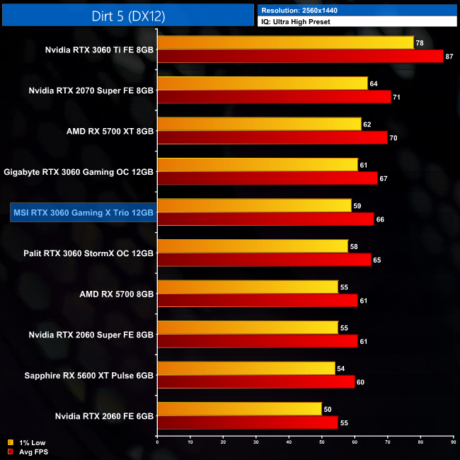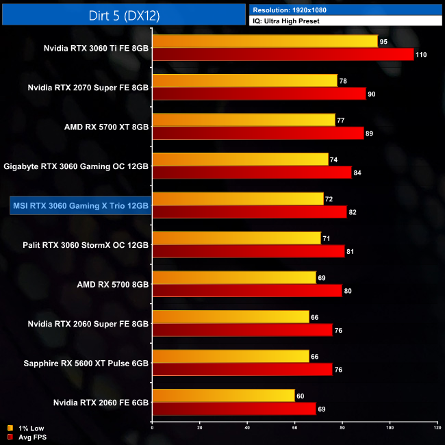 Next we come to Dirt 5, where the Gaming X Trio is 19% faster than the RTX 2060 Founders Edition. It's also just 1% faster than the Palit StormX OC when testing at 1080p.