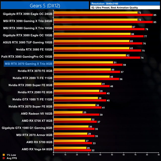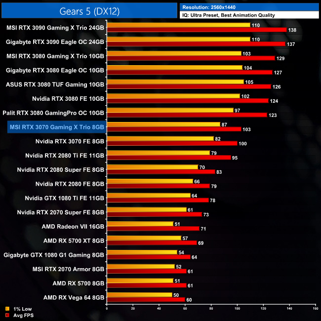 Gears 5 is one of the games where the Gaming X Trio benefits the most from its extra clock speed compared to the Founders Edition – it's 3% faster at 1080p and 1440p, but 4% faster at 4K.