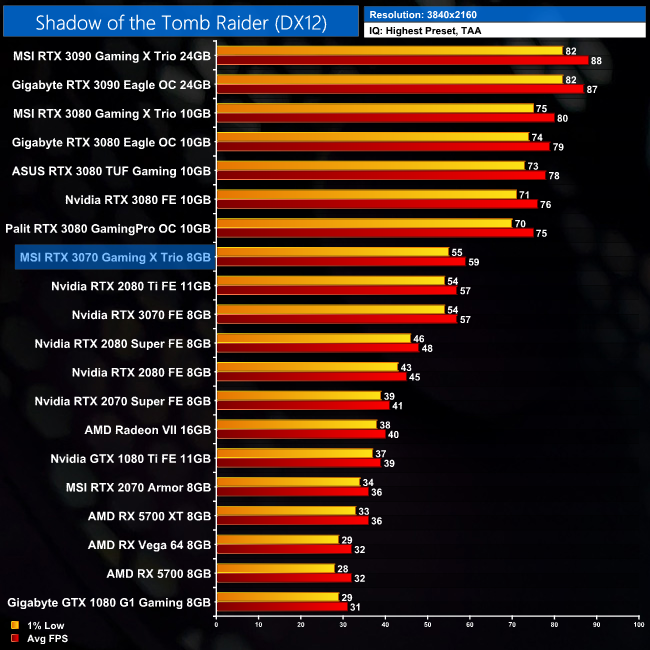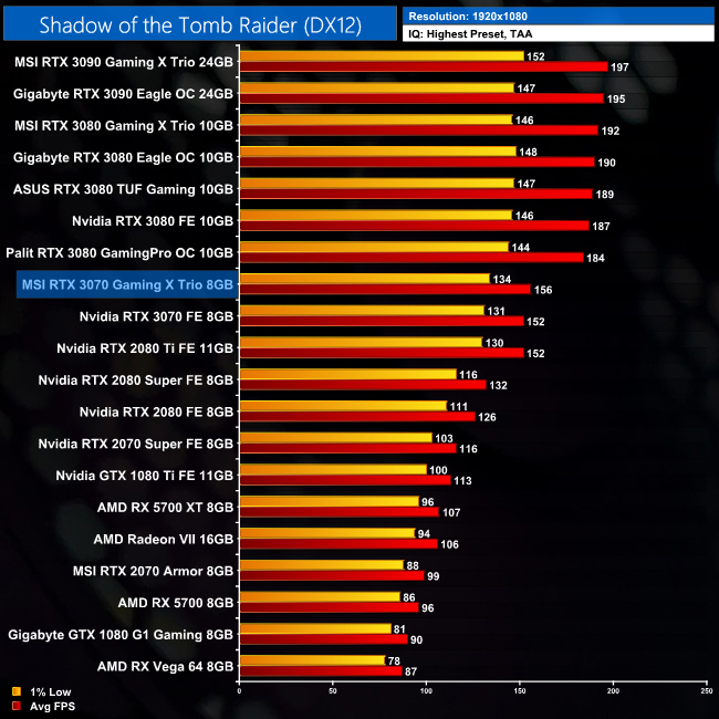 Shadow of the Tomb Raider sees slightly better results, as the Gaming X Trio outperforms the Founders Edition by 3% at 1080p and 1440p, and then by 4% at 4K.