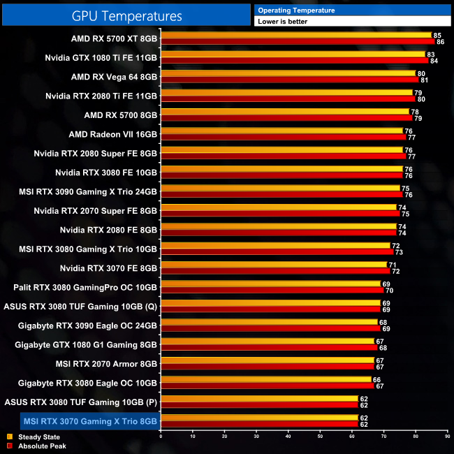 As for thermal performance, it immediately becomes obvious that using a cooler this large, even with one heatpipe missing compared to the RTX 3080 Gaming X Trio, is still more than enough to cool a 240W GA104 GPU. GPU temperature peaked at just 62C during my testing, which is a superb result and will surely take some beating from other AIB cards.