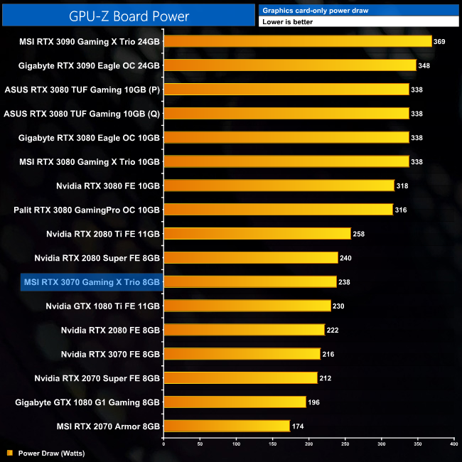 Looking at GPU-only power paints a clearer picture, and we can see the RTX 3070 Gaming X Trio averaged 238W under load, which is bang in line with its 240W target. This puts power draw 22W above the RTX 3070 Founders Edition, but still 20W less than RTX 2080 Ti FE.