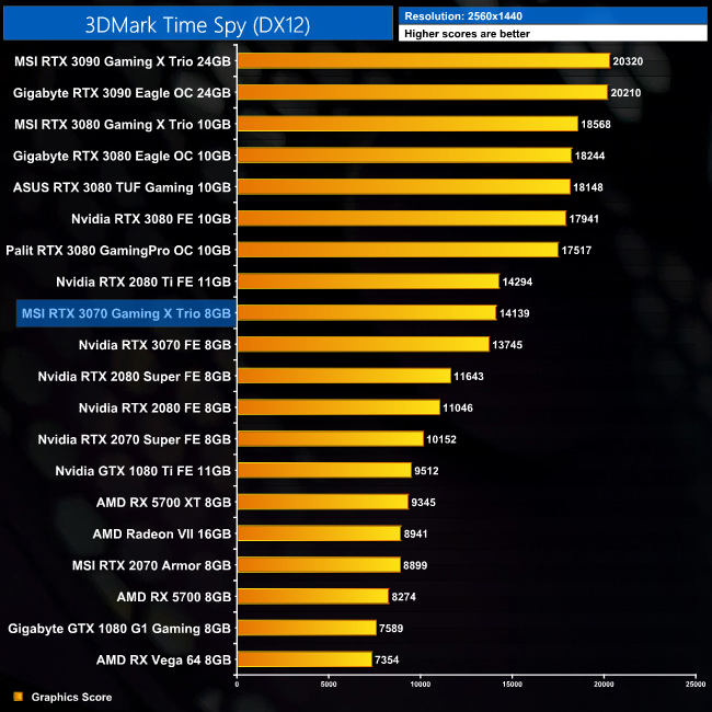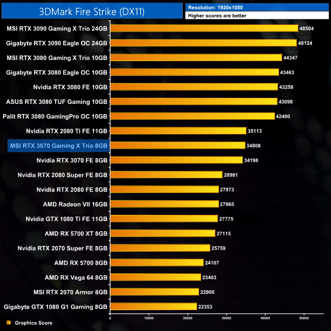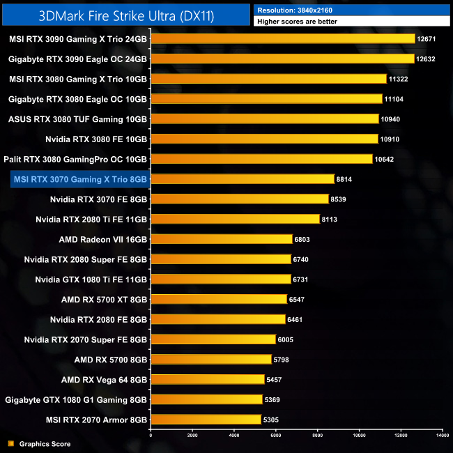 Kicking off with 3DMark, here we can see the RTX 3070 Gaming X Trio comes in 2% faster than the Founders Edition in Fire Strike, before increasing its lead to 3% in Time Spy and Fire Strike Ultra.