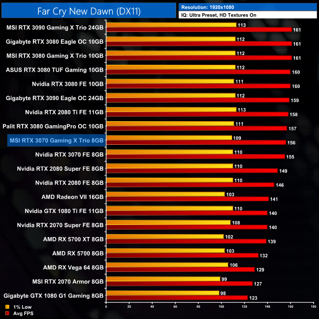 Far Cry New Dawn is fairly CPU limited at 1080p and even 1440p, but at 4K the Gaming X Trio pulls ahead of Nvidia's Founders Edition by 2FPS, or 3%.