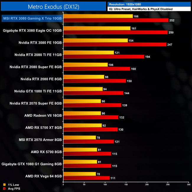 RTX 3080 chews through Metro Exodus, delivering over 100FPS even at 4K. The Gaming X Trio averages 104FPS at this resolution, which is both 4FPS and 4% better than the Nvidia Founders Edition.