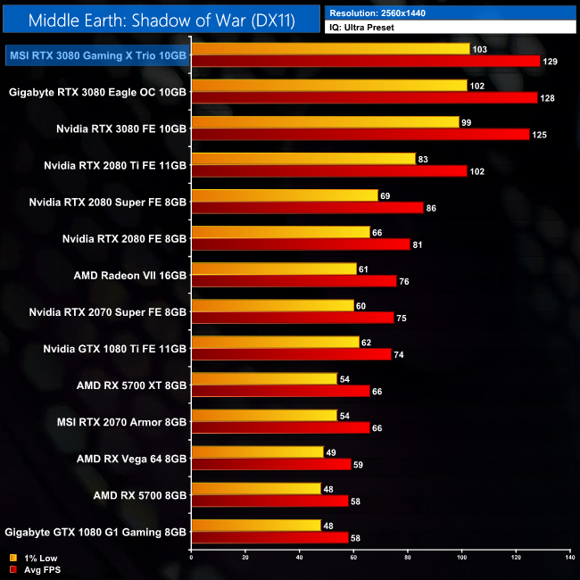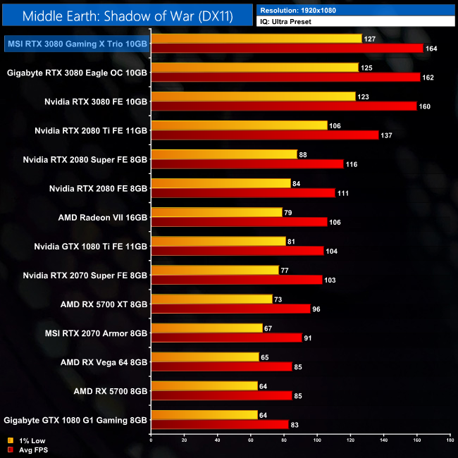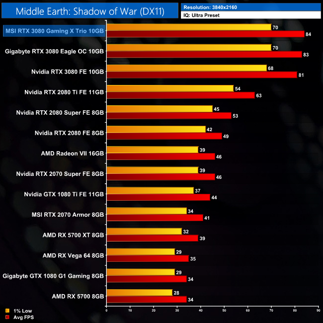 By now the overall performance trend of this card is well established, and Shadow of War provides another example of it – the Gaming X Trio shows a 4% performance uplift versus Nvidia's design, at 4K