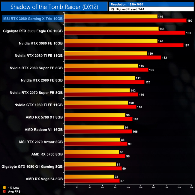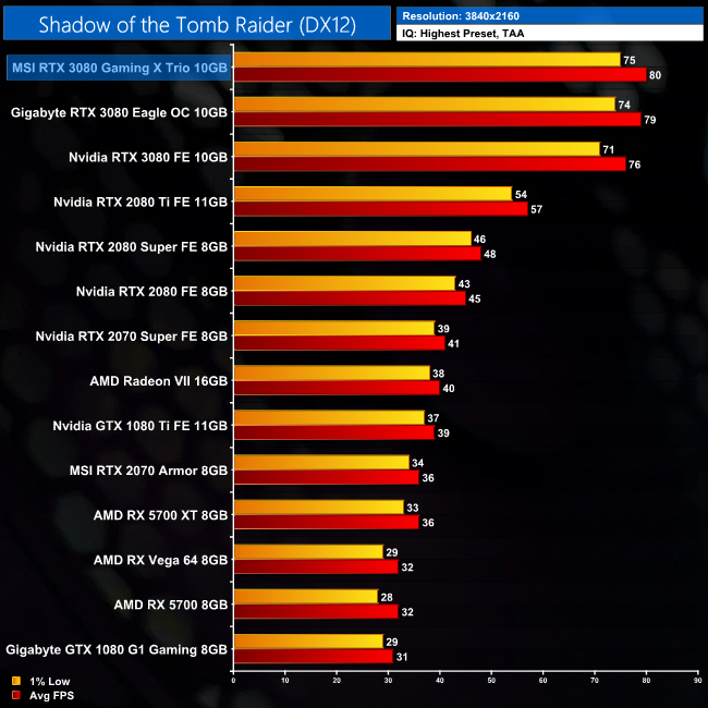 Just like Red Dead Redemption 2, the Gaming X Trio is 5% faster than the Founders Edition in Shadow of the Tomb Raider, when testing at 4K.