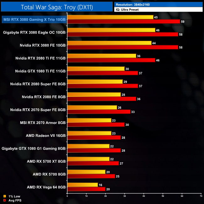 Total War Saga: Troy is the game that benefits least from the additional clock speed of the Gaming X Trio. It is just 1% faster than the Founders Edition at 1080p, but only 2% faster at 1440p and 4K.