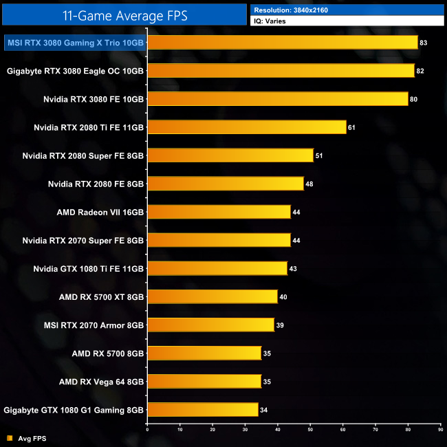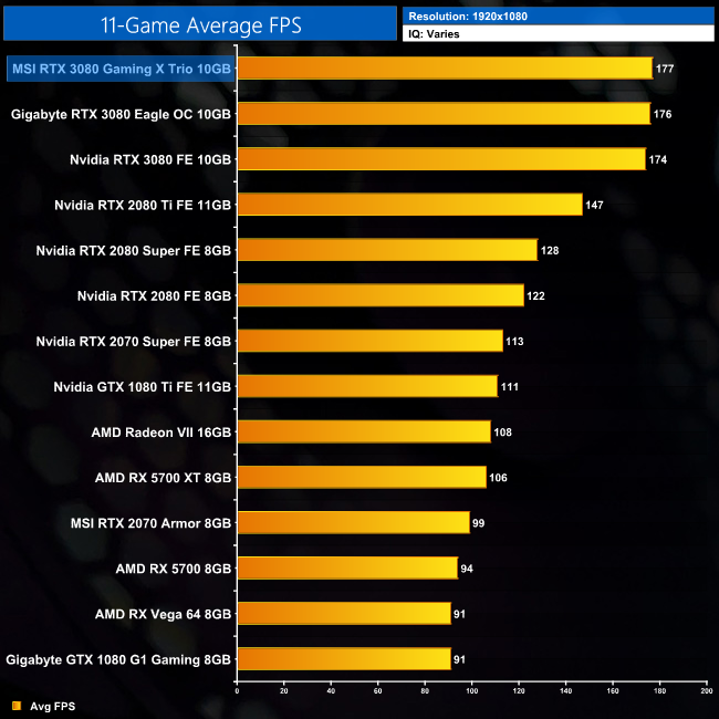 Based on the 11 games we looked at, it's no surprise to see the Gaming X Trio coming out as the overall performance leader, regardless of the resolution tested. It does show its biggest gains at 1440p and 4K, though, where it is on average 4% faster than the Nvidia Founders Edition.