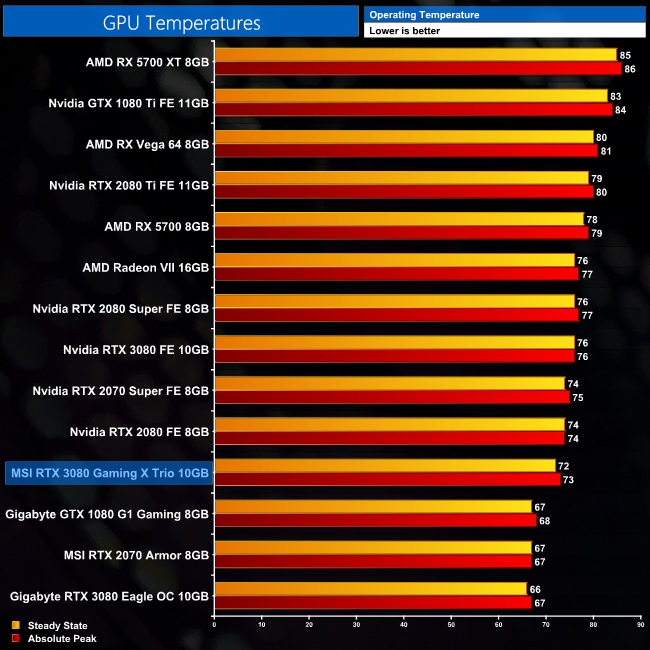 If we look at thermal performance in isolation, things may not seem so impressive here. We saw the GPU hovering between 72-73C during our 30 minute stress test, which is certainly not at all bad, and it is a 3C improvement over the Founders Edition. I was expecting slightly more from this cooler, however, considering its sheer size and new design features – but we find out more about this on the next page…