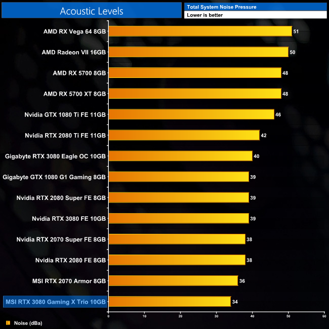It’s when we move to noise testing that we understand why the thermal performance wasn't as impressive as we hoped. Simply put, the Gaming X Trio is – for all intents and purposes – inaudible when under load. Its fans spun to about 1360rpm under load, but we measured noise levels at barely 34db from a 30cm distance, which is actually coming very close to our noise floor.