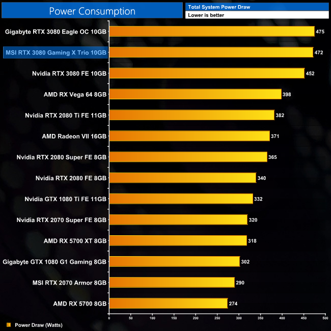 Total system power draw comes in just over 470W, putting this MSI card in a similar position to the Gigabyte Eagle.