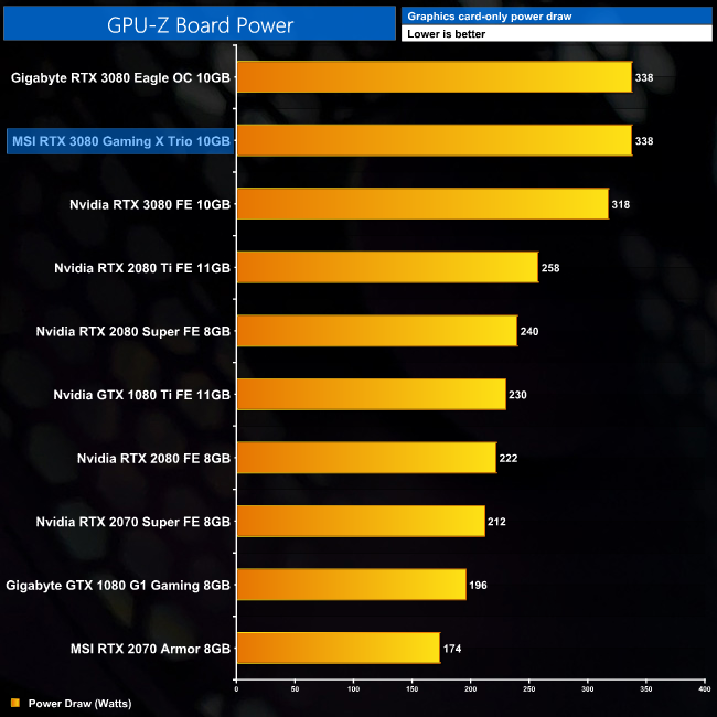 We also use GPU-Z to measure Board Power (graphics card-only power draw). This is currently only available for Nvidia cards, which is why we have excluded AMD results from the chart. Aside from the fact this is software-based reporting, and not a hardware measurement of the PCIe power cables and PCIe slot (for that we’d need something like PCAT), this should provide us more accurate data to work with as it is measuring only the GPU power, and not total system power which is a fundamentally imprecise measurement.
