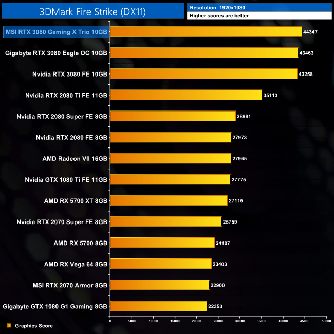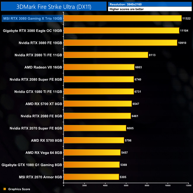 In our first 3DMark benchmarks, the performance of the Gaming X Trio is a little ahead of the Founders Edition. Its scores are 3% higher than the Founders Edition in Fire Strike and Time Spy, while that stretches to 4% in Fire Strike Ultra.