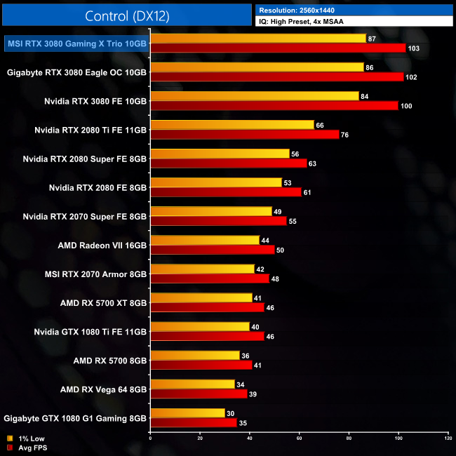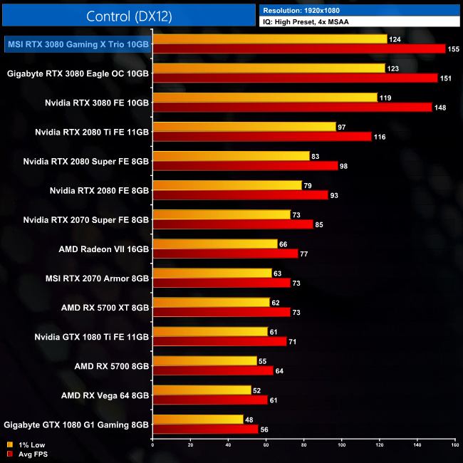 Our first game of the day is Control, and here the Gaming X Trio takes top spot at every resolution tested. At 4K, its 2FPS lead over the Founders Edition works out as a 4% performance uplift.