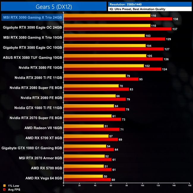 As for Gears 5, here the RTX 3090 hits 85FPS on average at 4K. This makes it 52% faster than the RTX 2080 Ti, and 13% faster than the RTX 3080 Founders Edition.