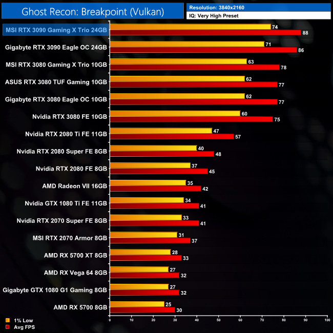 Of all the games we tested for this review, Ghost Recon: Breakpoint delivers the single biggest improvement for the RTX 3090 when compared to the RTX 3080 Founders Edition – MSI's card is 17% faster at 4K.