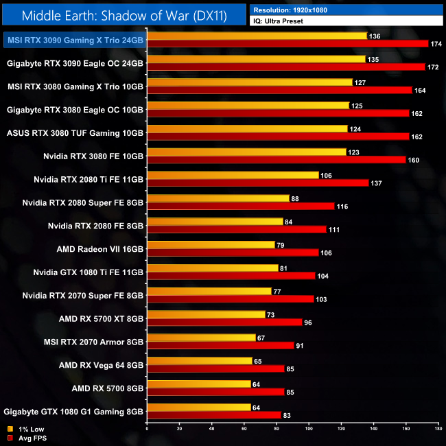 Middle Earth: Shadow of War sees frame rates come in a little short of 100FPS, but the RTX 3090 is still 16% faster than the RTX 3080, and 49% faster than the RTX 2080 Ti, in this title.