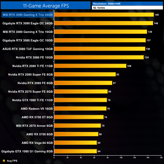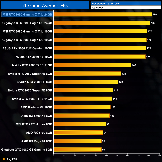 RTX 3090 does best at 4K, and we can see the MSI RTX 3090 Gaming X Trio averaged 91FPS at this resolution, across all 11 games we tested. This makes it a prime candidate for use with a high refresh rate 4K monitor. We can also see the MSI card averaged a single frame more than the Gigabyte RTX 3090 Eagle OC, thanks to its high boost clock.