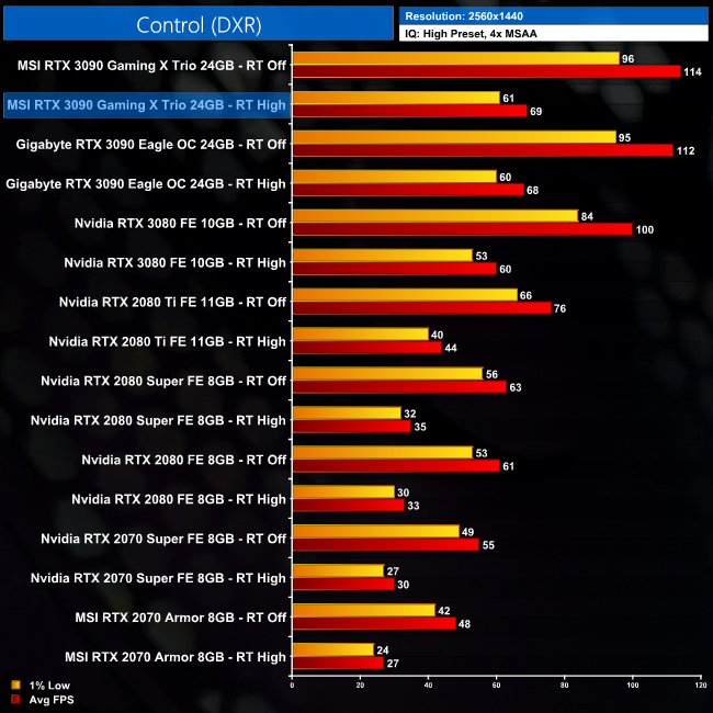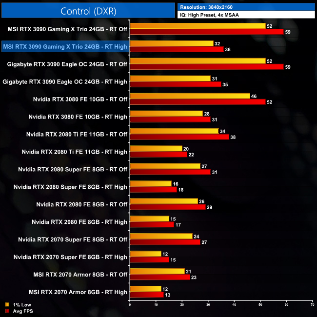 Re-testing Control with ray tracing effects set to High, drops the frame rate down to 36FPS for the RTX 3090 Gaming X Trio. This is 16% ahead of the RTX 3080, so relatively speaking, the performance margins with ray tracing enabled aren't any different to playing with ray tracing disabled in this game.
