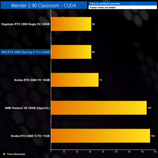 Starting off with Blender Classroom, first of all using CUDA. RTX 3090 completes this render in 62 seconds, down from 73 seconds for the RTX 3080 – a 15% reduction in total render time.
